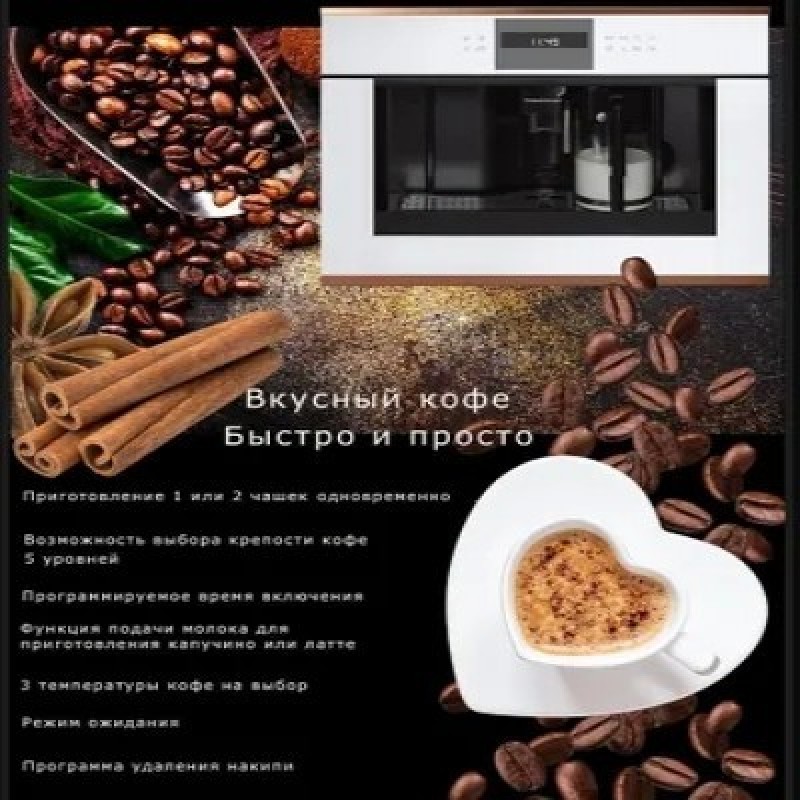 Кофемашина Kuppersbusch CKV 6550.0 ЖК-дисплей с текстовым и графическим полями Электронная система управления с сенсорными кнопками Программируемое количество кофе для 5 размеров чашек (эспрессо, малая, средняя, большая, высокая) Приготовление 1 или 2 чашек Функция подачи молока для приготовления капучино или латте Съемный контейнер для молока с функцией очистки Возможность использования кофейных зерен или молотого кофе Регулируемый по высоте раздатчик кофе Давление при заваривании 15 бар 3 температуры кофе на выбор Возможность выбора крепости кофе (5 предварительно заданных уровней) Отдельные нагреватели для заваривания кофе и приготовления горячей воды Программа удаления накипи Автоматическое ополаскивание при включении и отключении Емкость для воды заполняется спереди Электронный таймер с белыми индикаторами Программируемое время включения Режим ожидания Телескопические направляющие для легкого заполнения кофемашиныПодсветка чашекНаблюдение доставляет удовольствие - хорошо известный факт. Светодиодная подсветка преподносит только что сваренный кофе в правильном свете. И приготовление кофе становится хорошей традициейЕмкость для свежей водыДуховые шкафы и кофемашины Kuppersbusch легко встраиваются в любую кухонную мебель, так как благодаря наличию емкости для свежей воды подсоединение к водопроводу не требуютсяХарактеристики:Потребляемая мощность: 1,35 кВт (вилка Schuko)Размеры прибора (Ш x В x Г): 595 x 455 x 475 мм (вкл. фасад 20 мм и телескопические направляющие) Размеры ниши (Ш x В x Г): 560 x 450 x 550 мм
